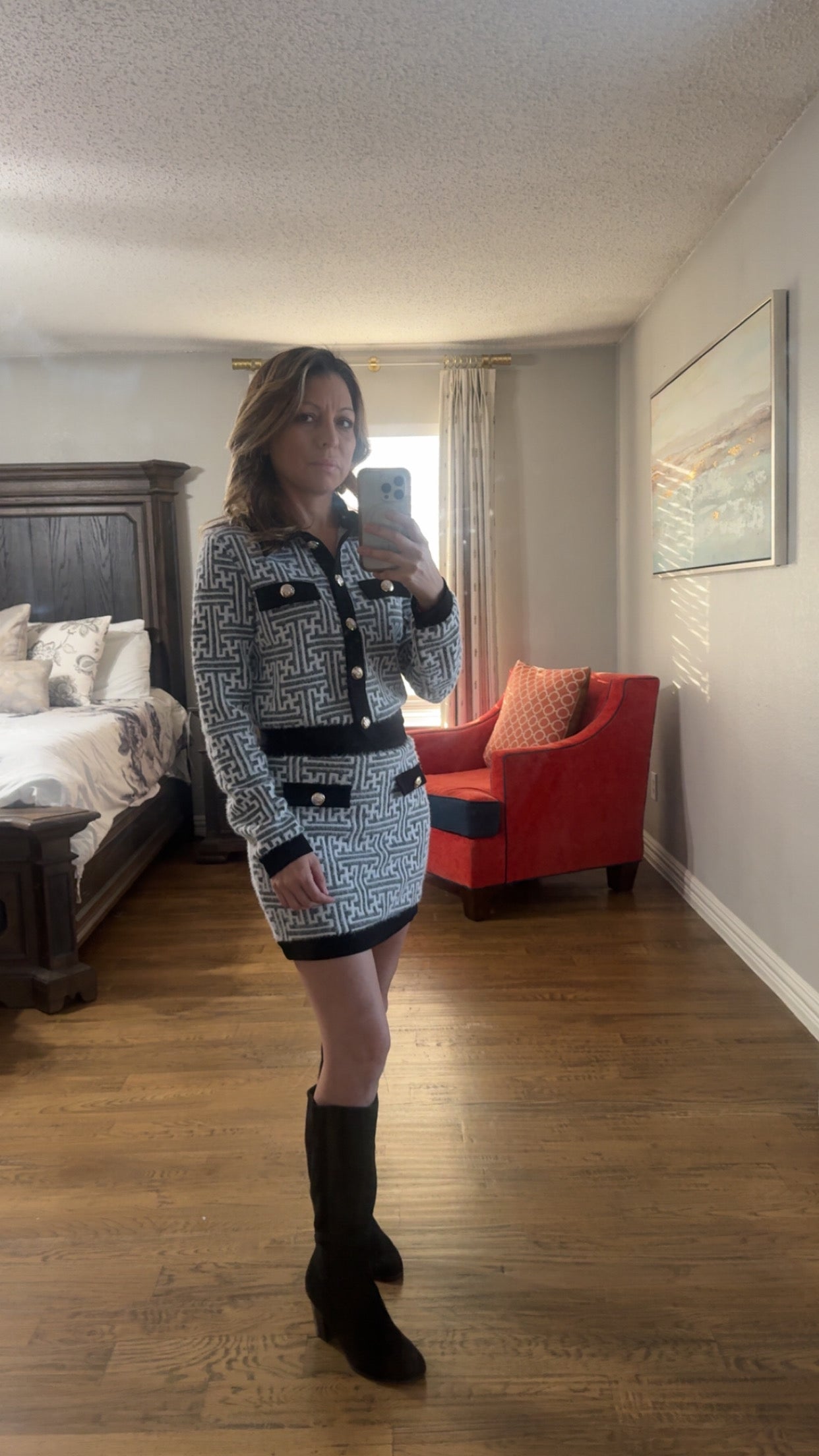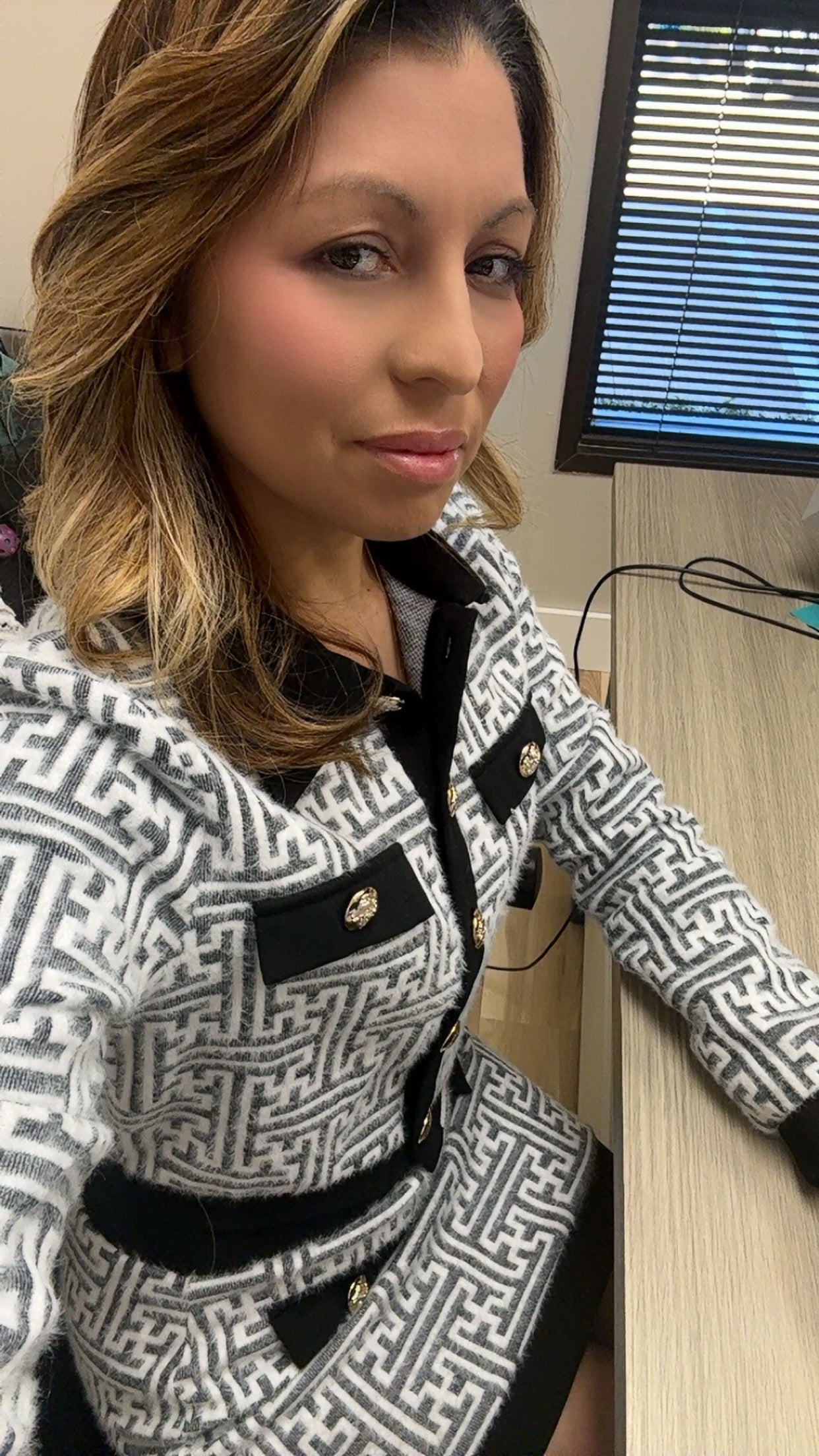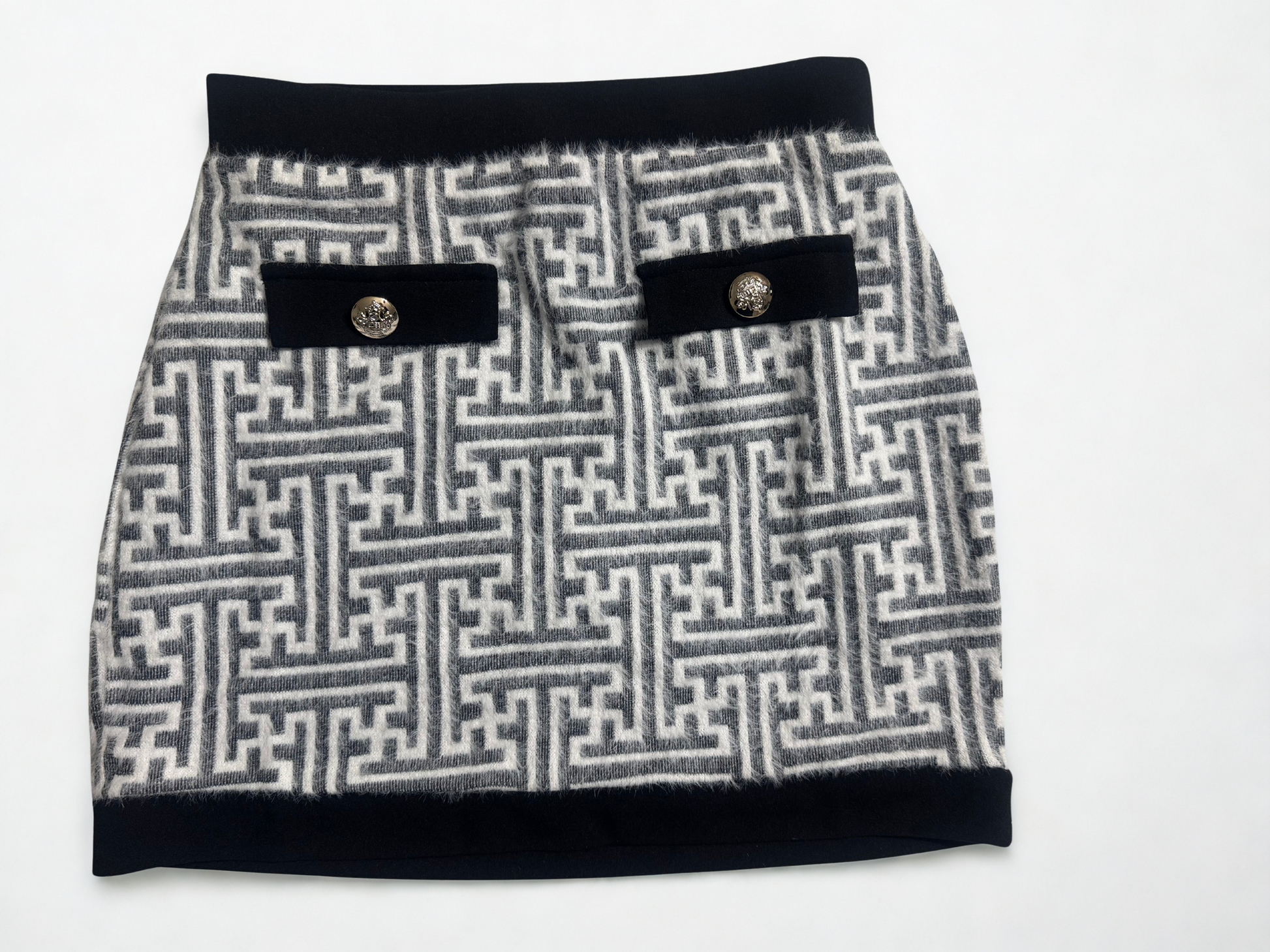 Timeless, elegant, and endlessly versatile — this Greek Key two-piece set is a true statement look. Designed in a luxe knit fabric with a flattering fit, this set features a collared button-down top and matching skirt with classic detailing.
